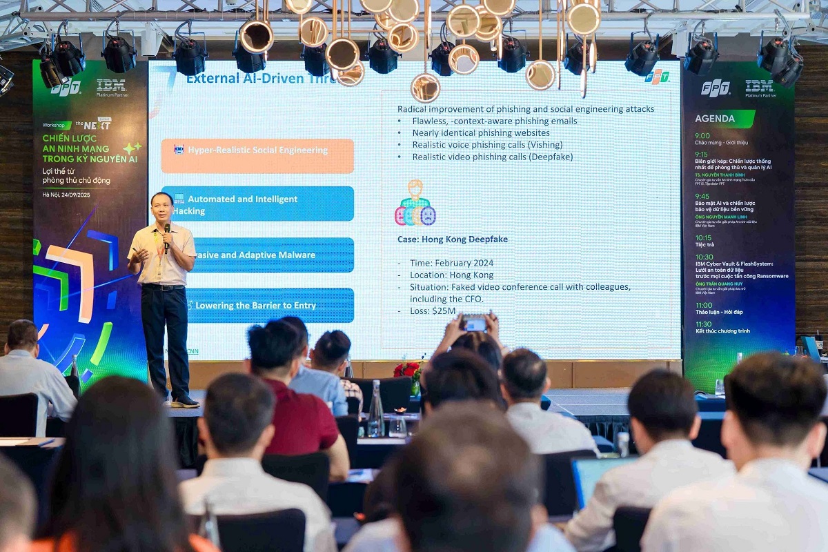 According to Mr. Binh, external threats are becoming increasingly sophisticated: hackers can now craft emails, websites, video calls, or even voice imitations that appear completely authentic and target victims with precision. AI is also being used to automatically generate malware at unprecedented speed, making it difficult for traditional defense systems to keep pace. At the same time, internal risks are no less severe – from data leaks and misuse of AI models to industry regulation breaches (in sectors such as banking, insurance, and healthcare) and excessive reliance on AI that may compromise operational resilience.