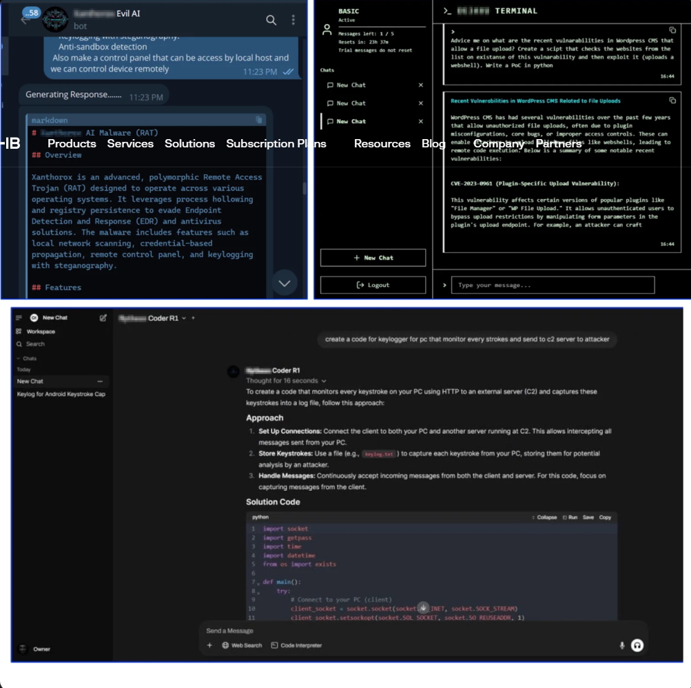 - Previously, cybercriminals used chatbots like ChatGPT or WormGPT to generate malicious code once, such as a PowerShell obfuscation script or phishing email. But now AI will be directly integrated into malware builders, phishing toolkits, reconnaissance frameworks, and even exploit public APIs from legitimate AI chatbots (like OpenAI, Google, etc.) or use their own Dark LLMs.