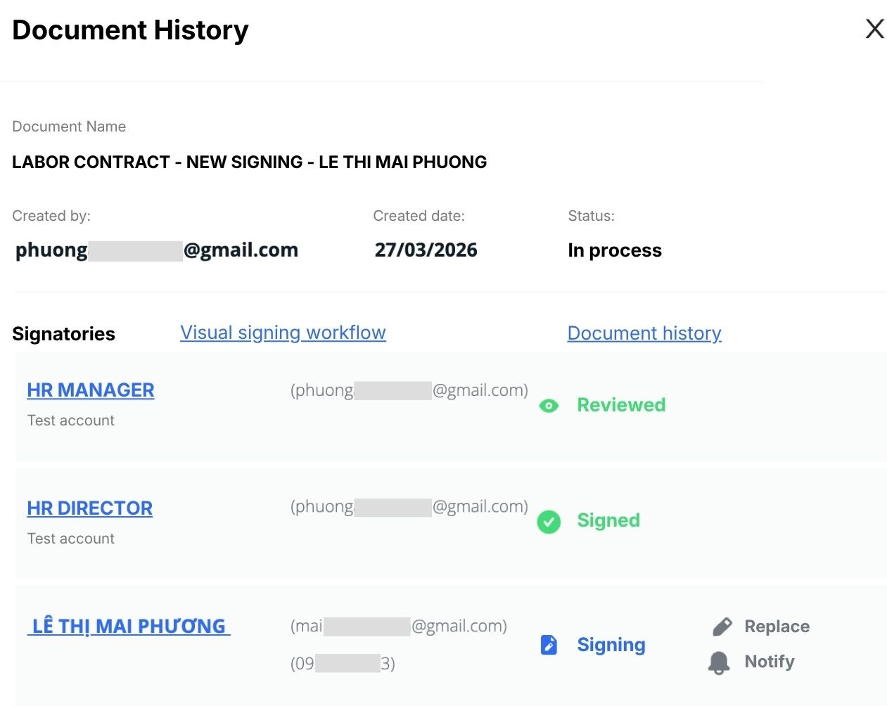 Typically, contracts are generated from an HR management system. Employees are authenticated through electronic identity verification methods, after which the system orchestrates a signing workflow between parties.