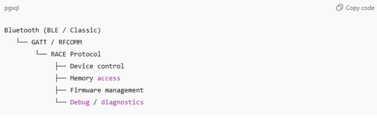 RACE (Remote Access Control Engine) is a vendor-specific protocol designed by Airoha Systems, integrated into the Bluetooth chip firmware used for headphones, earbuds, and wireless audio devices. In Airoha’s architecture, RACE functions as the device’s “management gateway”.