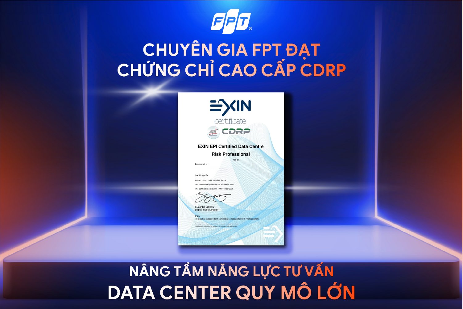 Vừa qua, đại diện FPT đã xuất sắc đạt chứng chỉ Certified Data Center Risk Professional (CDRP) – chứng chỉ cao cấp và có giá trị đặc biệt trong tư vấn cũng như đấu thầu các dự án Trung tâm dữ liệu (data center).