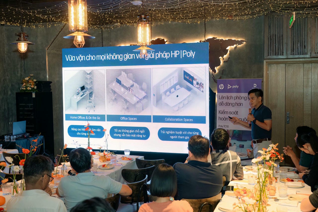 Mở đầu sự kiện, ông Nguyễn Dạ Hoàng Long – Phụ trách Phát triển đối tác ngành hàng HP Poly đã có phần chia sẻ về chủ đề “sẻ Giải pháp tối ưu cộng tác cho doanh nghiệp trong kỷ nguyên AI”. Ông Long cho biết: “Xu hướng làm việc linh hoạt đang ngày càng định hình lại cách vận hành của các tổ chức, và chính điều đó đã đưa giải pháp Video Conference trở thành lựa chọn ưu tiên trong môi trường doanh nghiệp hiện đại. Tuy nhiên, quá trình triển khai vẫn còn gặp rất nhiều vấn đề như: chi phí đầu tư, chất lượng hình ảnh, âm thanh, khả năng vận hành của thiết bị và trải nghiệm thực tế của người dùng khi làm việc cộng tác”. Để giải quyết những vấn đề này, HP Poly đã xây dựng một hệ sinh thái giải pháp Video Conference toàn diện, với đa dạng tùy chọn phù hợp nhiều mức ngân sách, doanh nghiệp có thể dễ dàng lựa chọn theo nhu cầu. Các sản phẩm không chỉ đảm bảo chất lượng âm thanh và hình ảnh vượt trội, mà còn hướng đến việc nâng cao trải nghiệm thực tế cho người dùng – từ đó góp phần nâng cao hiệu quả cộng tác và năng suất làm việc trong kỷ nguyên số.
