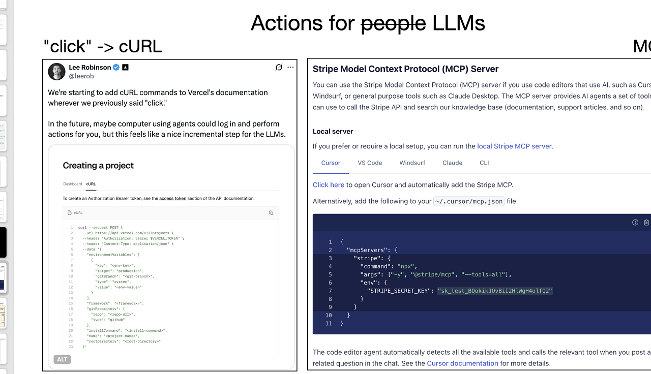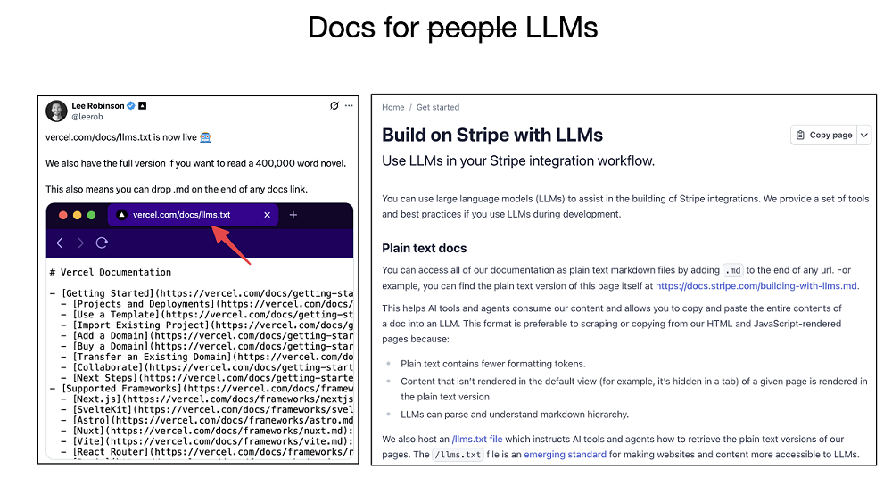 Đặc biệt, các công ty hàng đầu như Open AI, Vercel hay Stripe đã tiên phong trong xu hướng này. Họ tối ưu hóa toàn bộ API documentation để vừa dễ hiểu với con người, vừa “thân thiện” với AI, từ đó mở ra cách tiếp cận mới trong phát triển phần mềm.