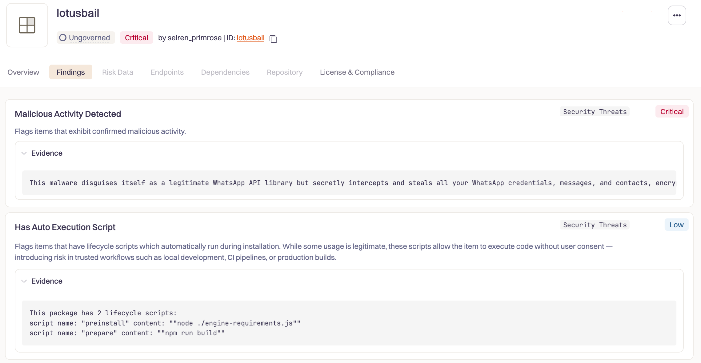 Cái Bẫy “API WhatsApp Chính Hãng” gói npm mang tên lotusbail được tải lên registry npm từ tháng 05/2025 bởi một người dùng tự xưng “seiren_primrose”. Với hơn 56,000 lần tải xuống, thư viện này trông giống hệt một Web API WhatsApp thực thụ, đủ để thu hút dev sử dụng nó trong các ứng dụng chat, automation, CRM, hay bot hỗ trợ khách hàng.