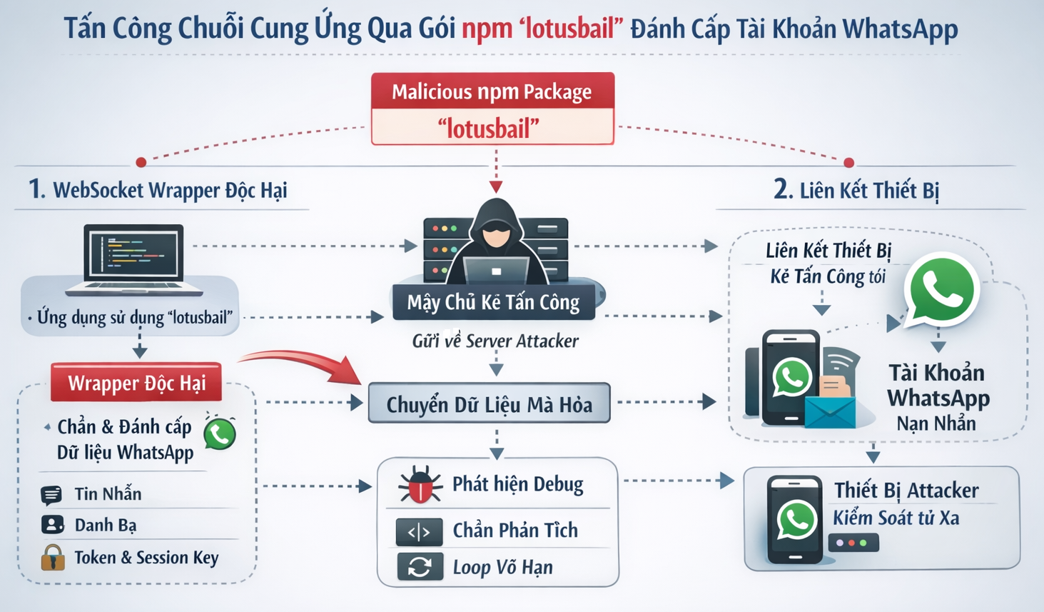 Ngày 22/12/2025, một chiến dịch tấn công chuỗi cung ứng (software supply chain attack) mới được lộ diện đã khiến cộng đồng phát triển phần mềm và DevOps toàn cầu phải đứng ngồi không yên. Một gói npm độc hại được đóng gói tinh vi đã tìm cách truy cập tài khoản WhatsApp của người dùng, thu thập tin nhắn, danh bạ và thậm chí liên kết thiết bị của kẻ tấn công với tài khoản nạn nhân mà không hề bị phát hiện.
