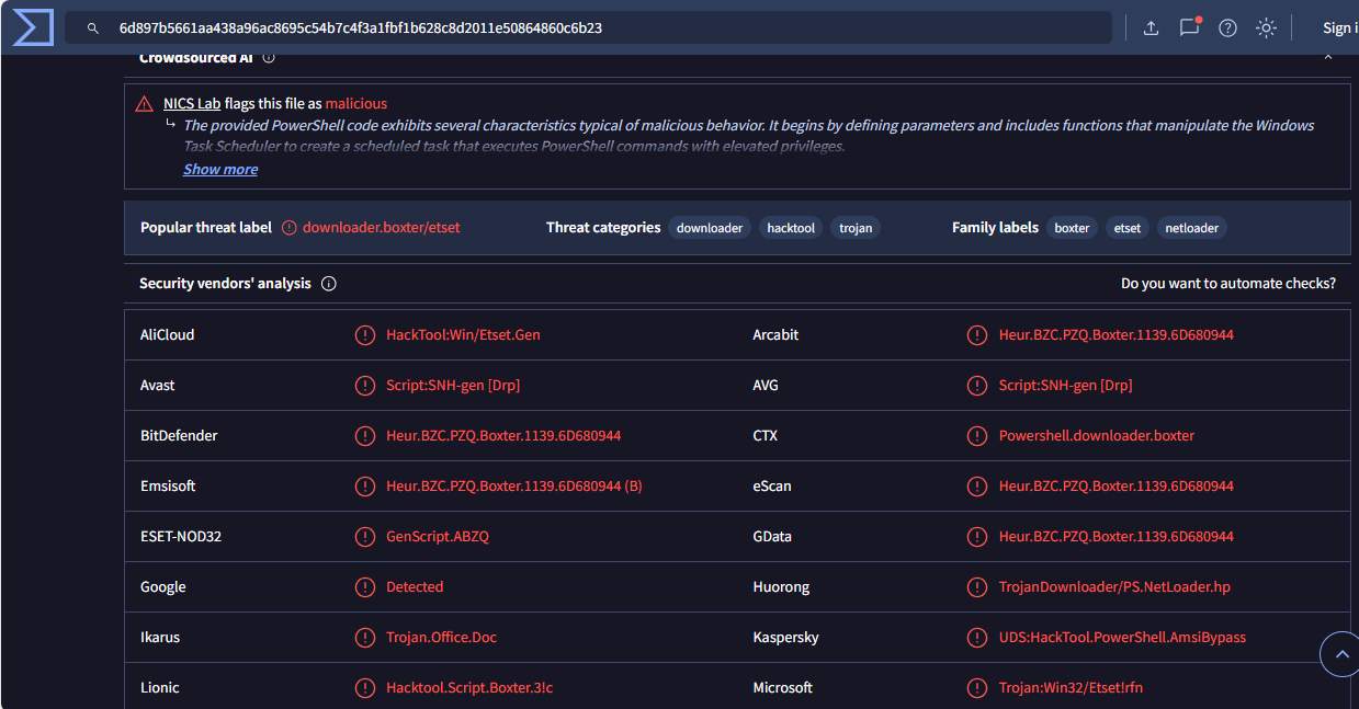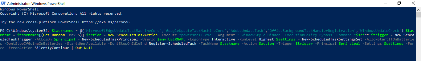 Mã độc sau khi đã được tải xuống nó sẽ thực thi một đoạn mã script nhằm mục đích tạo một Scheduled Task (tác vụ lịch) để thực thi powershell.exevới một lệnh và mã (được chứa trong biến $scr) mỗi lần người dùng đăng nhập. Và đương nhiên tác vụ được đặt tên bằng một trong các tên “hợp pháp/giống cập nhật” (ví dụ MicrosoftEdgeUpdateTaskMachineCore, GoogleUpdateTaskMachineCore, v.v.) để ngụy trang.