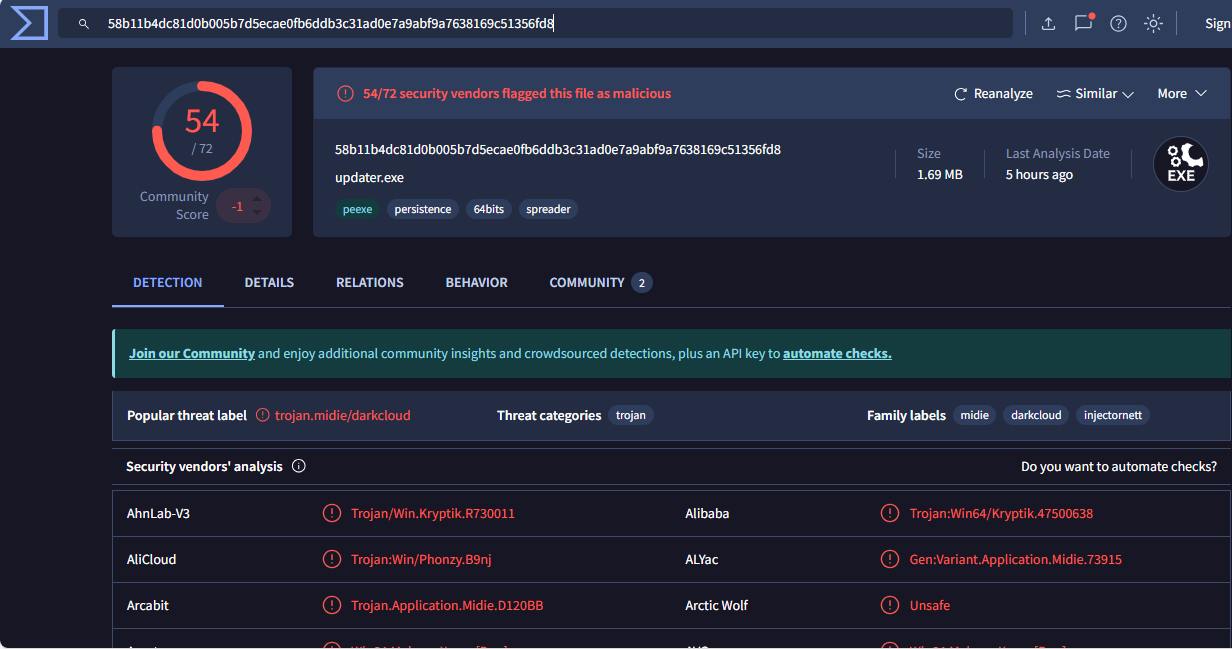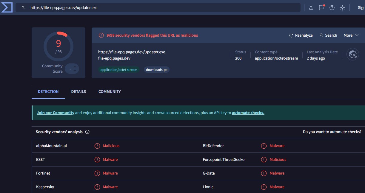 Sau đó mã độc thực thi sẽ được tải xuống ở giai đoạn tiếp theo và có liên quan tới AuroStealer từ đường dẫn: “https://file-epq.pages.dev/updater.exe“