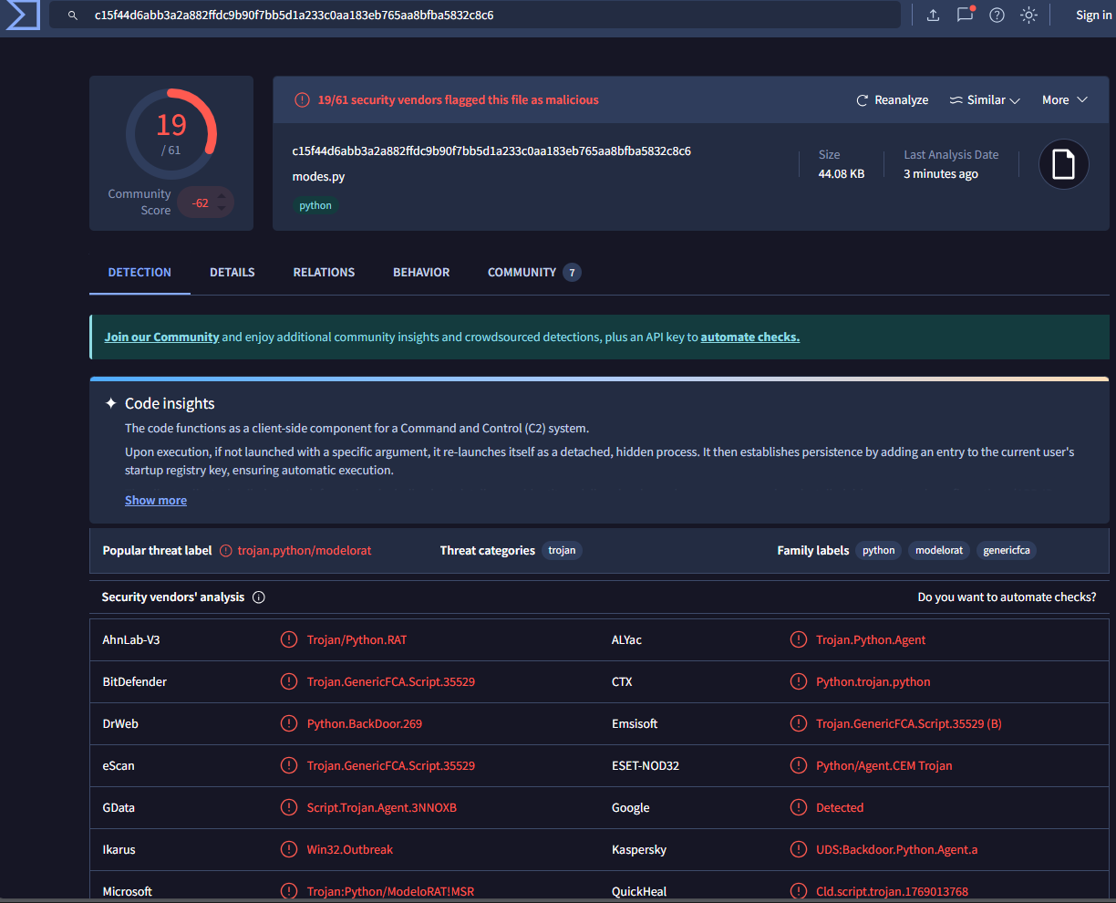 Tại đây ModeloRAT cũng sẽ được tải xuống, một payload thực sự và nguy hiểm. Mã độc này là một Remote Access Trojan (RAT) viết bằng Python với cái tên “modes.py“.