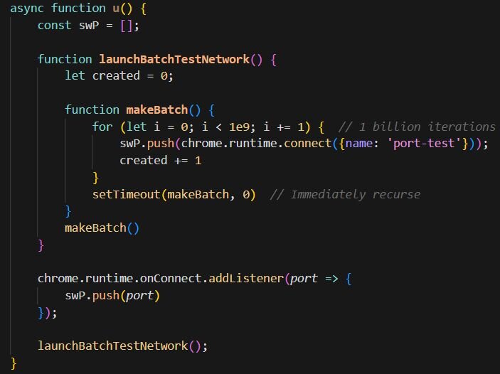 - Bơm một vòng lặp vô hạn tạo hàng tỷ kết nối nội bộ trong Chrome, gây cháy tài nguyên CPU/RAM → trình duyệt bị treo hoặc crash liên tục.
