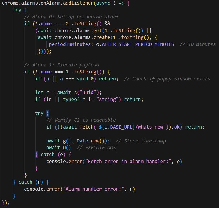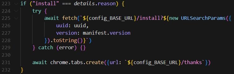 Extension này sẽ gửi một UUID (ID duy nhất) tới server C2 (command-and-control) và cho phép attacker theo dõi ai đã cài, khi cập nhật hay gỡ. Một điểm nữa như đã nói thì URL C2 dùng khá tinh vi với typo nhỏ (nexsnield.com thay vì nexshield.com) để tránh bị phát hiện.