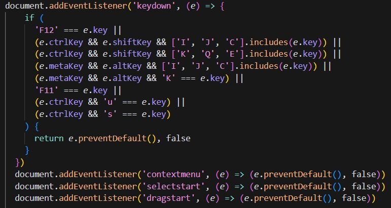Đương nhiên bất kể mã độc nào cũng sẽ thực hiện chống phân tích khi vào máy nạn nhân. Với NexShield cũng vậy nó sẽ khóa sử dụng DevTools như (F12, Ctrl+Shift+I/J/C), vô hiệu hóa menu chuột phải cũng như chặn hành động bôi đen, kéo thả từ người dùng.