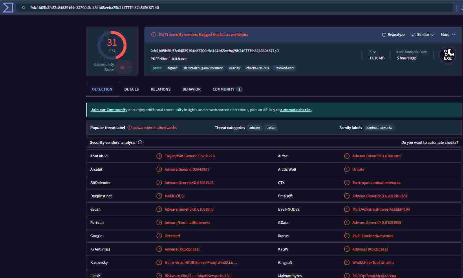 Ban đầu những kẻ tấn công sẽ lừa nạn nhân tải phần mềm độc hại thông qua các lời chào hấp dẫn. File độc hại PDFEditor_Setup.exe được ghi nhận thường được quảng bá trên web giả mạo với nội dung hấp dẫn: “PDF Editor miễn phí”, “không cần đăng ký”. Và đương nhiên các phần mềm này đều có chữ ký số giả mạo, giúp vượt qua cảnh báo của trình duyệt hoặc hệ điều hành.