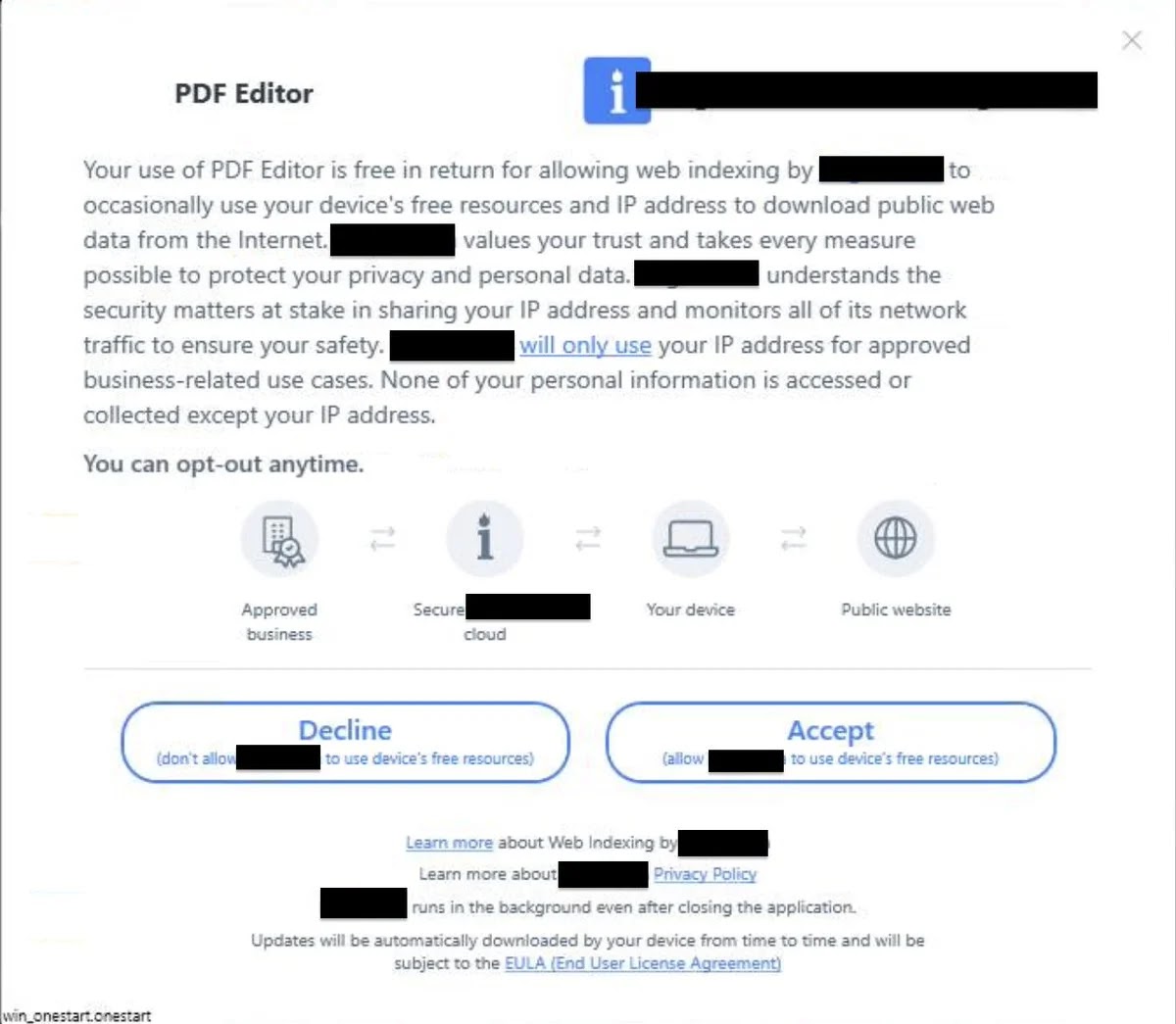 Thời gian gần đây một phần mềm chỉnh sửa PDF miễn phí phổ biến đã bị lạm dụng để phát tán mã độc trojan. Phần mềm này được thiết kế để biến thiết bị người dùng thành các nút proxy — đóng góp vào cơ sở hạ tầng botnet cho các hoạt động trái phép.