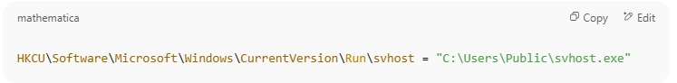 Sau khi nạn nhân đã tải và cài đặt phần mềm này thì mã độc sẽ được thực thi, nó sẽ bắt đầu giải nén mã độc thực sự (svhost.exe) vào thư mục tạm thời hoặc C:\Users\Public\. Những kẻ tấn công có thể sử dụng kỹ thuật Process Hollowing để chạy svhost.exe ẩn danh dưới tiến trình Windows hợp pháp như explorer.exe.