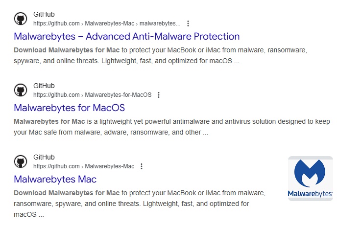 Chiến dịch này thường bắt đầu bằng các quảng cáo Google được tài trợ hoặc thủ thuật SEO – Search Engine Optimization (tối ưu hóa kết quả tìm kiếm). Điều đó có nghĩa là, khi người dùng tìm các từ khóa như “Malwarebytes Github MacOS”, rất có thể các liên kết giả mạo sẽ xuất hiện ở ngay đầu trang kết quả. Với tâm lý tin tưởng vào quảng cáo hoặc kết quả top đầu, người dùng dễ dàng nhấp vào mà không hề nghi ngờ.