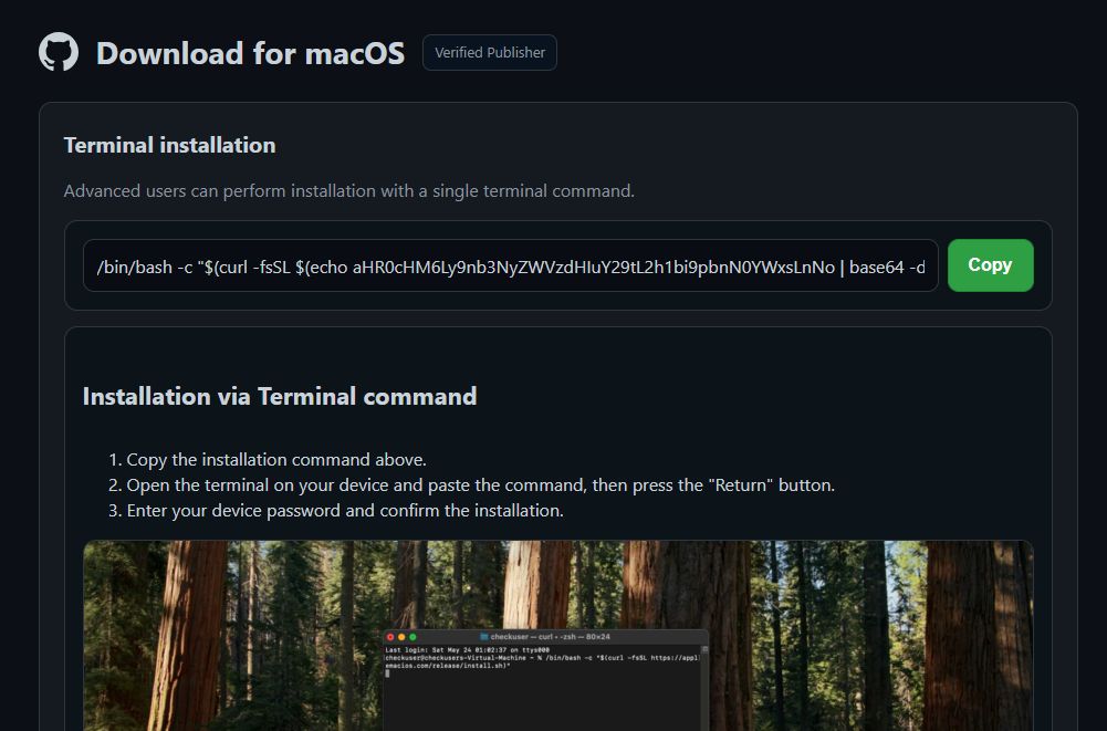 Để làm được điều này, chúng thiết lập các trang GitHub trông giống hệt trang chính thức của nhà phát triển. Nhiều người khi nhìn vào sẽ khó lòng phân biệt thật – giả, vì trang được thiết kế đầy đủ thông tin, có nút tải xuống và thậm chí đi kèm hướng dẫn cài đặt chi tiết.