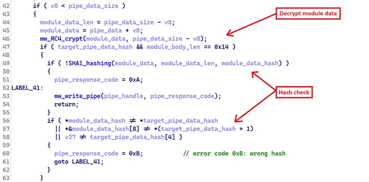 - Tải mô-đun động: Thay vì chứa sẵn toàn bộ chức năng, PipeMagic nhận các payload module qua kênh liên lạc đặc biệt gọi là named pipe (