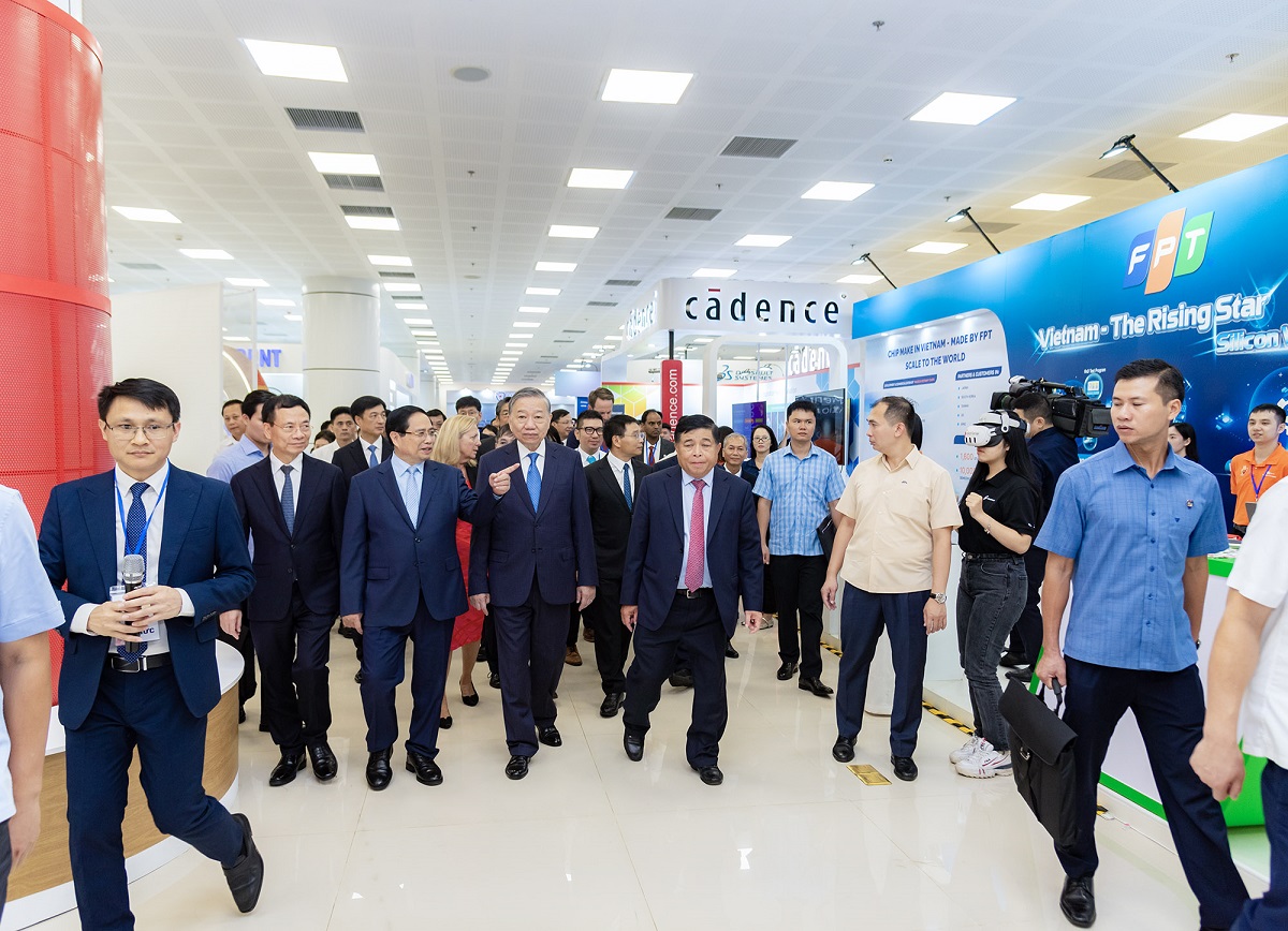 Tổng bí thư Tô Lâm, Thủ tướng Chính phủ Phạm Minh Chính và Lãnh đạo Đảng, nhà nước tham quan gian hàng FPT.